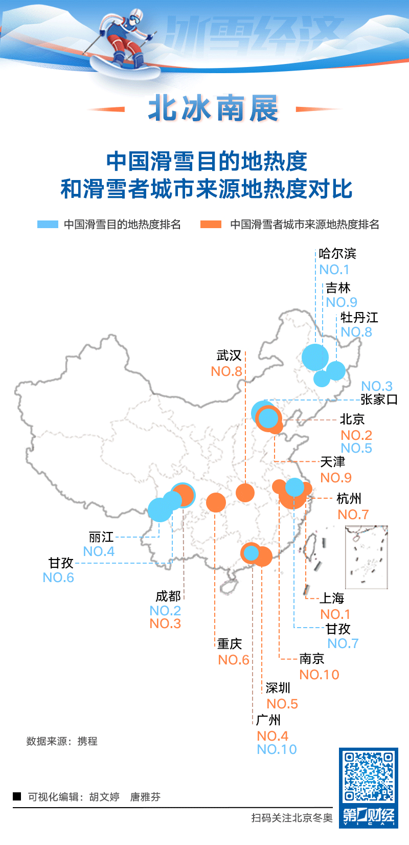 2020年中国热门滑雪目的地城市排名中,哈尔滨搜索量最大,稳居第一;而滑雪爱好者来源地排名中,除了北京、天津以外,排名居前的是上海、成都、广州、深圳等南方城市。同样《中国冰雪旅游发展报告2020》显示,2018至2019冰雪季内,上海游客量位居榜首,人气最高的旅游路线为哈尔滨、亚布力和雪乡。北方的天然雪质加上南方的消费观念,促成了当下盛行的 “北冰南展”。