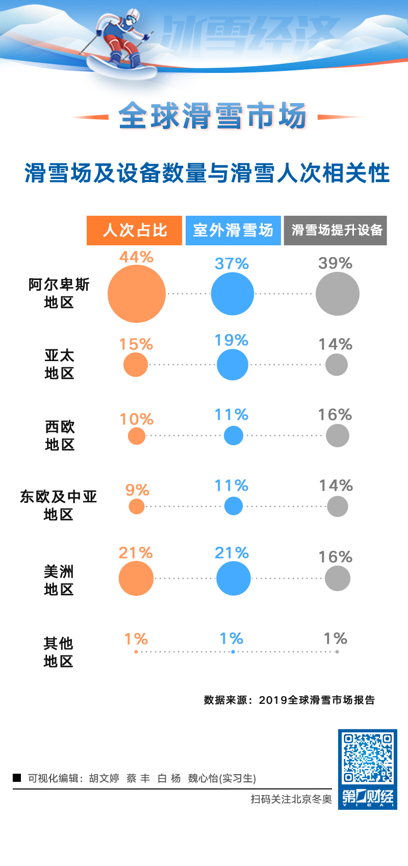 作为地球上最大的滑雪市场,阿尔卑斯山区的滑雪场占有了全球44%的滑雪人次数,这个地区的设施也是最齐备和先进的,拥有超过一万条索道。在《2019全球滑雪市场报告》中,可以清楚看到,这种滑雪场数、硬件设施和滑雪者参与率的正相关性也覆盖到了包括亚太、西欧、东欧、美洲在内的其他地区。