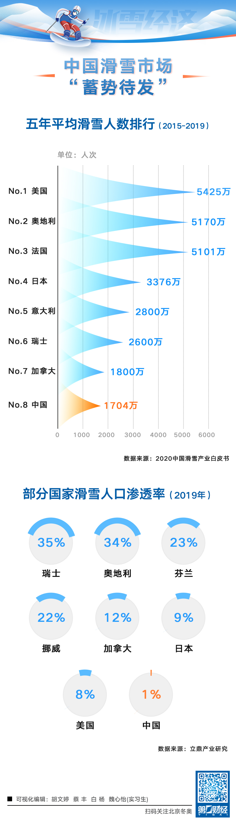 由于自然条件和起步晚等因素,与滑雪市场成熟的国家比,中国滑雪市场人数少,人口渗透率还较低。根据《2020中国滑雪产业白皮书》,中国人口基数大,但五年平均滑雪人数1704 万人次,仅排在全球第8位。