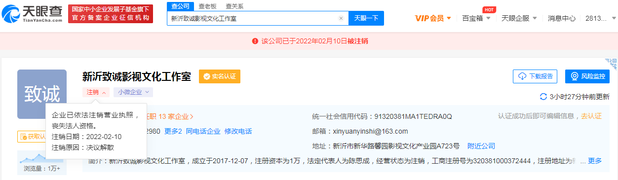 天眼查App显示,近日,新沂致诚影视文化工作室企业状态变更为注销,注销原因为决议解散。该工作室成立于2017年12月,为陈思成(陈思诚)个人独资企业,经营范围包括文艺创作与表演;组织文化艺术交流活动;影视制作服务等。