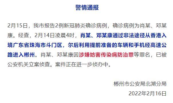 2月16日,湖南郴州市公安局北湖分局发布警情通报称,2月15日,湖南郴州市报告2例新冠肺炎确诊病例,确诊病例为肖某、邓某康。经查,2月14日凌晨4时,肖某、邓某康通过非法途径从香港入境广东省珠海市斗门区,尔后利用提前准备的车辆和手机经高速公路进入郴州。肖某、邓某康因涉嫌妨害传染病防治罪等罪名,已被公安机关立案侦查。案件正在进一步侦办中。