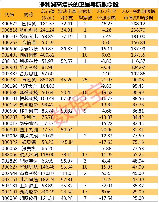 数据宝梳理了净利润增幅逾25%的卫星导航概念股名单。市场表现方面,29股自新年以来平均下跌10.66%,仅劲嘉股份、合众思壮、四维图新、杰赛科技等4股涨逾5%;上海沪工和国科微回撤居前,幅度均超30%。