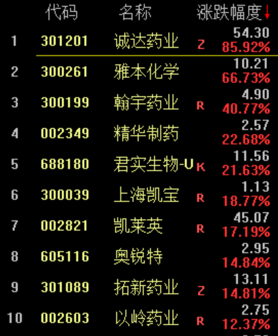 或受利好消息提振,本周新冠药概念股强势大涨,一周涨幅达到12.43%,位居一周概念板块涨幅榜首位。从个股表现上看,诚达药业一周涨幅达到85.92%,雅本化学周涨幅达66.73%。