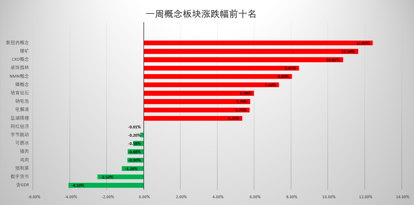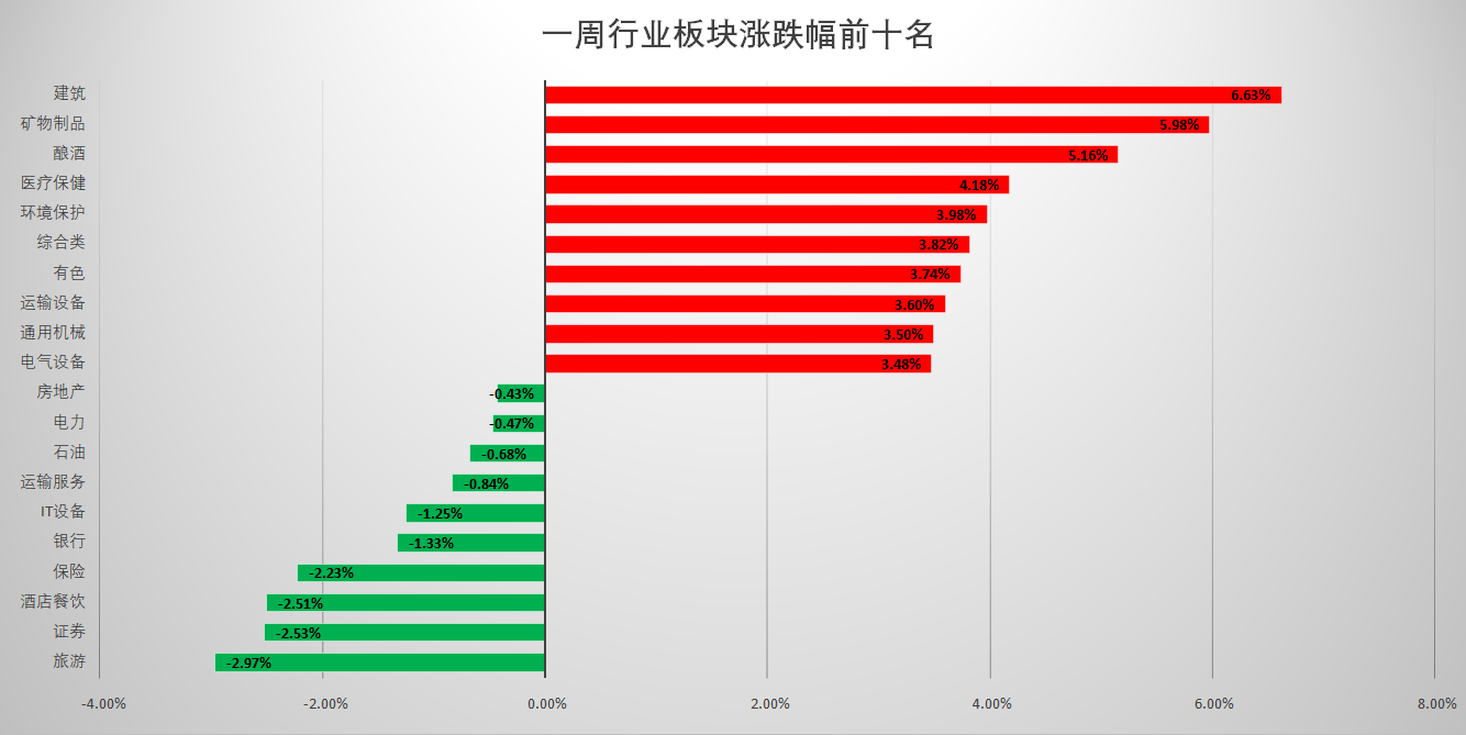 从一周板块表现来看,行业板块中,建筑、矿物制品、酿酒、医疗保健等板块领涨,旅游、证券、酒店餐饮等板块跌幅居前;新冠药概念、锂矿等板块表现强劲,数字货币、预制菜等板块跌幅居前。