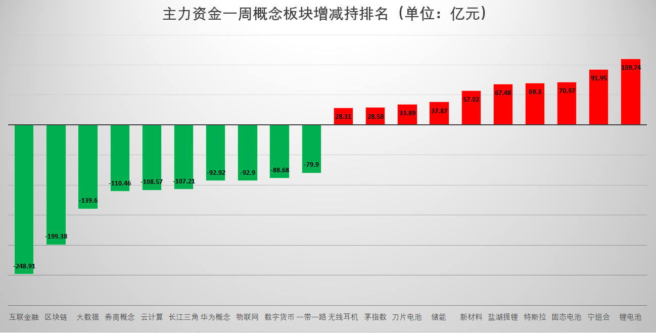 本周锂电池概念板块获得主力资金垂青,净流入达到109.74亿元,位居主力资金一周概念板块增持榜首。从个股上表现看,鞍重股份一周涨幅居前,达到60.99%,中矿资源周涨幅达到25.62%,启迪环境、融捷股份均涨超20%。