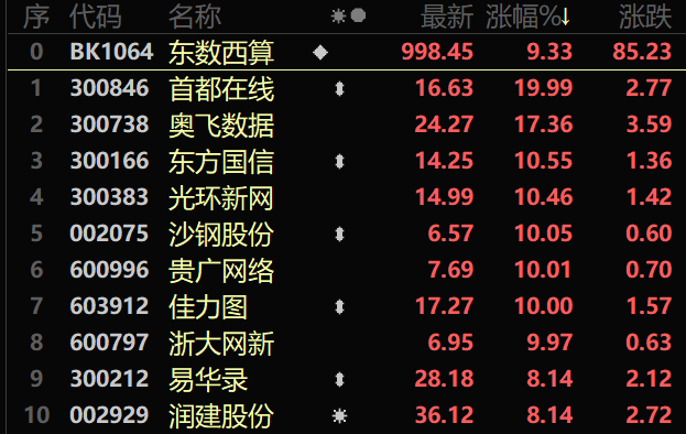 本周五,东数西算概念股爆发,涨幅达到9.33%。截至当日收盘,首都在线上涨19.99%,奥飞数据上涨17.36%,东方国信、光环新网、沙钢股份、贵广网络均涨超10%。