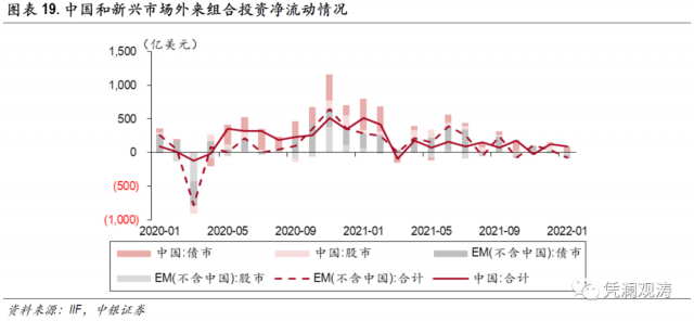 国际金融协会(IIF)最新数据显示,1月份,受美联储货币紧缩的溢出效应影响,除中国以外的新兴市场由上月净流入35亿美元转为净流出77亿美元;中国依然为净流入,但净流入规模由上月123亿美元收窄至88亿美元。就外来股票投资而言,除中国以外的新兴市场净流出32亿美元,上月为净流入38亿美元;中国净流出2亿美元,为2020年10月份以来首次净流出。就外来债券投资而言,除中国以外的新兴市场净流出规模由上月3亿美元扩大至45亿美元,为2020年4月份以来新高;而受益于中国经济稳增长政策预期,净流入中国资金由上月8亿美元扩大至90亿美元(见图表19)。