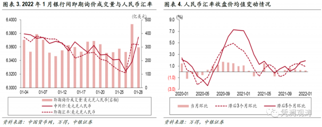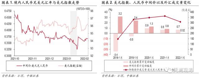 2021年底,人民币汇率与美元指数走势出现明显背离。进入2022年1月,人民币汇率与美元指数的跷跷板关系有所恢复,1月3日至13日,美元指数下跌1.1%,中间价升值0.3%。不过,1月14日至26日,美元指数转为上行,而人民币汇率继续升值,升破6.33关口,创下2018年5月份以来新高。受鲍威尔鹰派言论影响,美元指数于1月26日至28日接连升破96、97关口,创下2020年7月份以来新高,人民币因此出现快速回调,中间价在27日、28日累计下跌500个基点(见图表1)。