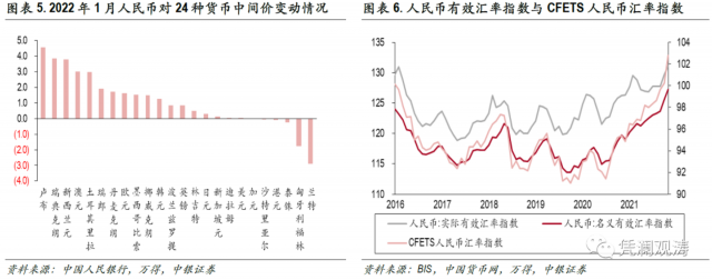 1月份,美元指数上行,大多数非美货币出现贬值,而人民币对美元汇率较为稳定,这意味着人民币对其他非美货币偏强。当月,人民币兑银行间外汇市场(即中国外汇交易中心系统,CFETS)交易的24种货币的中间价以升值居多(兑18种货币的中间价出现升值,兑6种货币的中间价有所贬值)(见图表5),因此,月末CFETS人民币汇率指数升至103.43的历史新高,环比上涨0.9%。