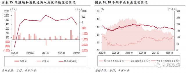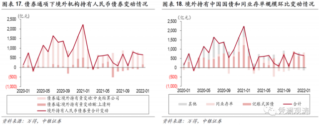1月份,债券通项下境外机构净增持人民币债券663亿元,已经连续10个月净增持,但环比下降5%,同比下降70%。这反映了中美货币政策重新错位、中美利差进一步收窄的影响。当月,日均10年期中美国债收益率差99个基点,环比回落了38个基点(见图表16)。