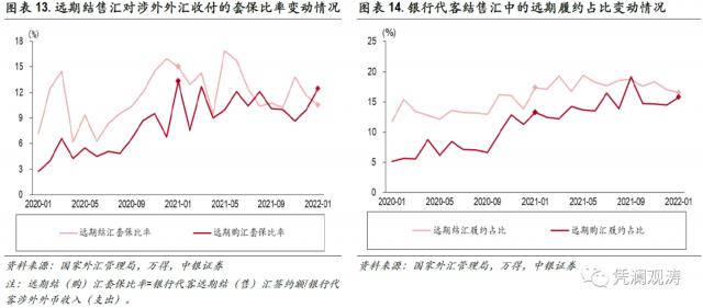 1月份,以远期结汇签约额占银行代客涉外外币收入比重衡量的远期结汇对冲风险比例为10.5%,同比回落4.5个百分点,环比连续两个月累计回落3.3个百分点;以远期购汇签约额占银行代客涉外外币支出比重衡量的远期购汇对冲风险比例为12.5%,同比小幅回落0.8个百分点,但环比连续两个月累计上升3.8个百分点(见图表13)。当月,银行代客结汇中的远期结汇履约占比为16.5%,较上年同期回落0.8个百分点,为2021年以来新低;银行代客售汇中的远期购汇履约占比为15.8%,较上年同期上升2.5个百分点,为近四个月以来新高(见图表14)。