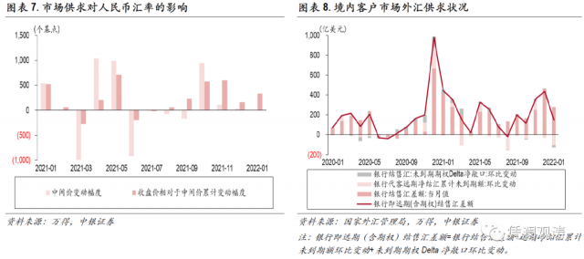1月份,CNH相较于CNY总体偏贬值方向,境内外汇差均值为+73个基点,上月为+52个基点;1年期NDF隐含的人民币汇率预期均值为-0.23%,与上月持平,继续偏贬值方向。可见,人民币汇率强势态势由在岸市场主导,受实需而非预期驱动。当月,人民币汇率中间价上涨11个基点,收盘价相对中间价偏强累计贡献了335个基点(见图表7),收盘价偏强交易日占比为74%。