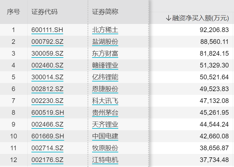 从个股来看,北方稀土、盐湖股份、东方财富、赣锋锂业、亿纬锂能获融资净买入规模居前,金额分别为9.2亿元、8.9亿元、8.2亿元、5.1亿元、5.1亿元;五粮液、陕西煤业、中国平安、宁德时代、紫金矿业遭净买入规模居前,金额分别为10.2亿元、6.5亿元、6.2亿元、5.9亿元、5.9亿元。