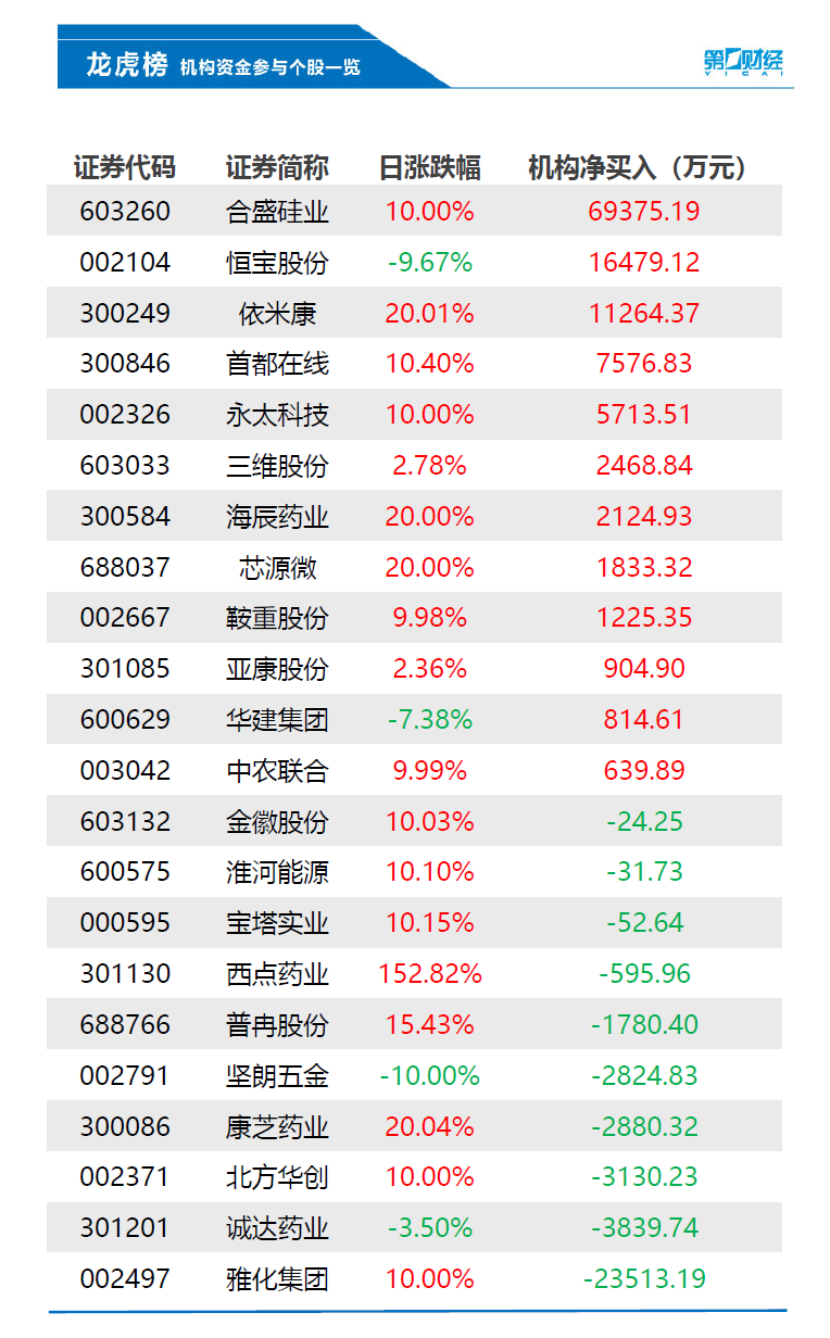 当天机构净买入前三的股票分别是合盛硅业、恒宝股份、依米康,净买入金额分别为6.94亿元、1.65亿元、1.13亿元。