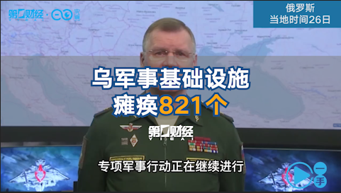 当地时间2月26日,俄罗斯国防部发布最新公告表示,俄罗斯武装部队已使821个乌克兰军事基础设施瘫痪,其中包括14个军用机场,19个军事通信站点,24个S-300和 "奥黄蜂 "及其它防空导弹系统,48个雷达站。此外,俄军共击落击落7架战机,7架直升机,9架无人机,击毁87辆坦克和装甲战车, 28座多管火箭炮,118辆特种军用车以及8艘乌克兰海军舰艇。