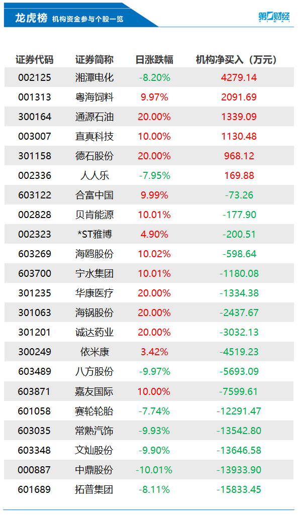 当天机构净买入前三的股票分别是湘潭电化、粤海饲料、通源石油,净买入金额分别为4279万元、2091万元、1339万元。