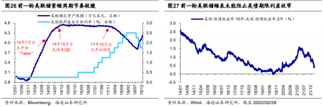为何美联储预期本轮的缩表要加快?我们在前文分析过,美联储开启加息时美债短端利率的上行斜率要高于长端利率,这也导致了美债期限利差的迅速收窄,此时便需要缩表来抬升美债长端利率以避免收益率曲线倒挂的风险。而从前一轮缩表后市场的反应来看,2017年10年开始的缩表并未达到期望的效果,可以发现美联储开启缩表后美国的10年期和2年期国债利率之间的利差进一步收窄。参考圣路易斯联储主席James Bullard在2019年时提出的观点,美联储缩表效果不佳可能是由于“当政策利率已明显高于0时,缩表将不能够带来任何政策指引的信号”。目前美国10年期和2年期国债的利差已明显低于上一轮加息开始前的水平,若本次缩表紧接着加息进行,那么美联储这次更早更快的紧缩对美债的长端利率或有更强的推动作用。