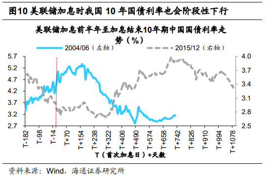 我国10年期国债利率存在“以我为主”的阶段。再看我国,由于我国的10年期国债利率与自身的货币政策环境更为相关,因此在美联储货币政策紧缩的周期内我国10年期国债利率走势也曾多次出现背离,其中较为典型的阶段为2005年、2015年和2018年。