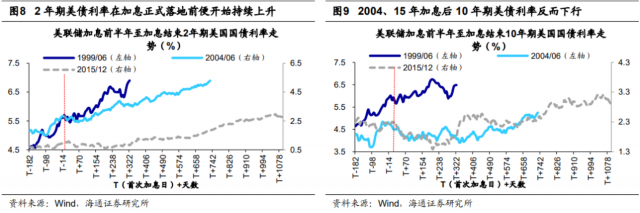 10年期美债利率有概率走出“N型”。相比短端利率,美联储加息对美债长端利率的影响则相对没那么直接。在加息预期不断升温的阶段,美国10年期国债利率持续上行,而在首次加息正式实施后短期内美债长端利率反而有概率下行,例如2004年6月和2015年12月首次加息后美国10年期国债利率反而下行,从高点的最大下行幅度为0.5和1.0个百分点,但拉长时间来看历史上美联储整个加息周期内美国10年期国债利率最终仍是上升的。