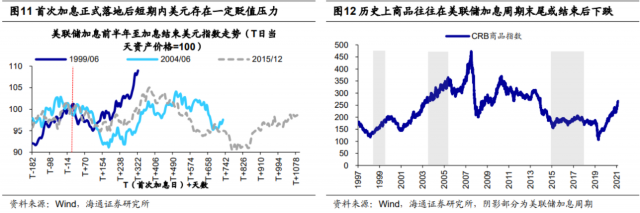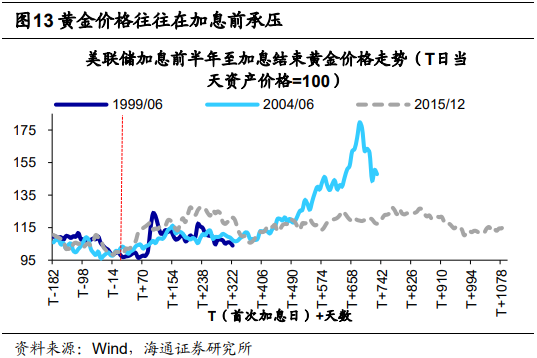 ③大宗商品:价格整体上涨,黄金走势呈“?型”。除了2015年以外,1999年以来美联储开启加息时往往是全球通胀不断升温的阶段,因此在过去美联储加息预期升温直至最后一次加息结束期间,大宗商品价格基本处于持续攀升的态势,近三轮加息周期中CRB指数的最大涨幅均在30%左右。直至美联储加息周期到了尾声或者加息结束后,此时全球经济增长动能往往呈走弱的趋势,大宗商品的价格才开始出现较为明显的回调。