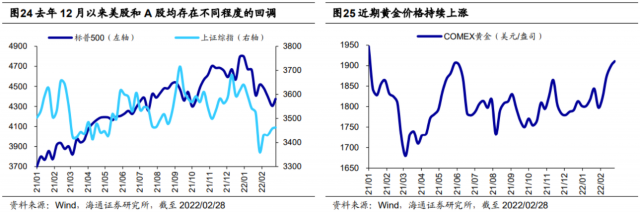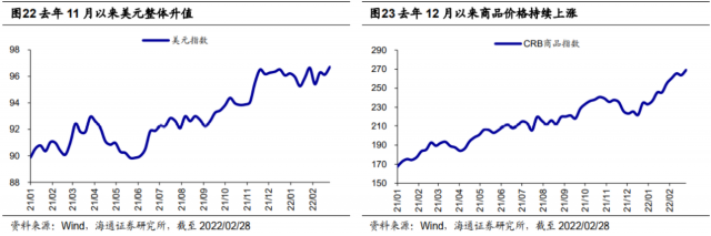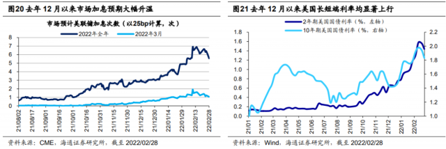 去年12月以来资产走势已基本反映了美联储加息预期。目前来看虽然本轮美联储加息周期尚未正式落地,但市场实际早已开始有所预期,利率期货隐含的2022年全年预期加息次数(以一次加息25个BP计算)已从去年12月的2-3次升至今年2月最高的6-7次,且在3月至少加息一次的预期概率为100%。从各类资产的表现来看,美联储加息对大类资产的潜在影响已经在过去三个月有所体现:美国的10年期和2年期国债利率自去年12月以来均开始加速上行;美元指数自去年11月以来(截至2022/02/28,下同)上涨约3%;同时以原油为代表的大宗商品价格也在持续上行,去年12月以来CRB指数上涨了约23%,其中WTI原油价格上升了39%;权益市场方面,随着美联储加息预期的不断发酵,中美的权益市场均存在不同程度的回调,自去年12月高点以来标普500下跌约9%,上证综指约6%,恒生指数约6%;近期黄金价格走势则与历史规律有所不同,过去三轮美联储加息预期升温阶段黄金价格均承压,而去年12月以来金价已上涨7%,一定程度上体现了目前市场对地缘政治风险的担忧。
