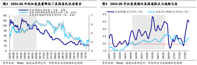 2004年6月美联储因通胀压力开始加息,但在会议上提出“尽管通胀数据在逐渐抬升,但长期的通胀预期依然处于可控水平,因此将尽可能以可衡量的节奏退出宽松”,即紧缩幅度和速度超预期的概率较低。事后来看在这轮的美联储加息周期中,每次议息会议都无一例外地宣布将基准利率上调25个BP。