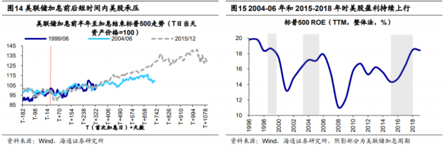 理论上,美联储加息通过抬升无风险利率来限制权益市场的估值水平,进而使得股票资产承压,因此当权益市场的估值本身较高时,美联储接连加息后高估资产将存在泡沫被刺破的风险,例如2000年加息后美股的互联网泡沫就此破灭。然而若美联储加息时上市公司的盈利水平持续改善,则持续上行的盈利有望对冲估值下行的压力。因此尽管在2004-06年和2015-2018年时美联储进入加息周期,但此时美股盈利整体处于上行趋势中,进而使得美股在整个加息周期里仍延续涨势。