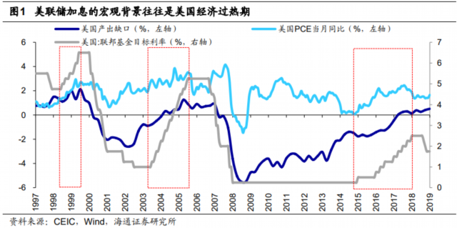 最近三次美联储加息的共同宏观背景:经济和通胀均上升的过热期。回顾历史,美联储最近的三次加息周期分别发生在1999/06-2000/05、2004/06-2006/06、2015/12-2018/12,以美国的产出缺口和PCE当月同比来衡量,近三次加息周期内美国经济整体均处在增长动能不断强化同时通胀持续上行的阶段,即经济周期中的过热阶段。