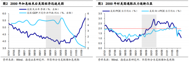 到了2000年美国通胀的压力开始逐渐凸显,PCE当月同比在1999年12月突破了2%后持续上行。当时的美联储在2000年2月的议息会议上提出,“因股市而不断膨胀的财富在一定程度上抬升了购买力和支出水平,而这需要更高的利率来平衡”。因此在2000年2、3、5月的会议上美联储接连宣布加息,最后一次更是宣布一次性将基准利率上调了50个BP。本轮加息周期结束后互联网泡沫就此终结,美国的经济增长动能也迅速走弱,实际GDP同比增速从2000Q2的5.2%一路走低至2001Q4的0.2%。