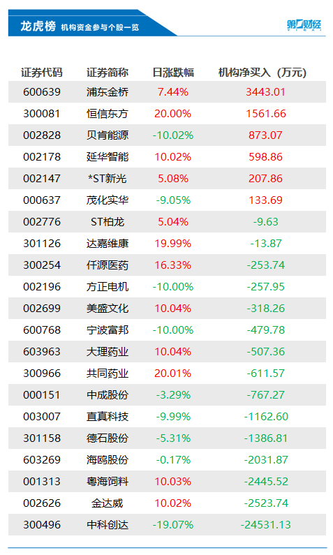 当天机构净买入前三的股票分别是浦东金桥、恒信东方、贝肯能源,净买入金额分别为3443万元、1562万元、873万元。