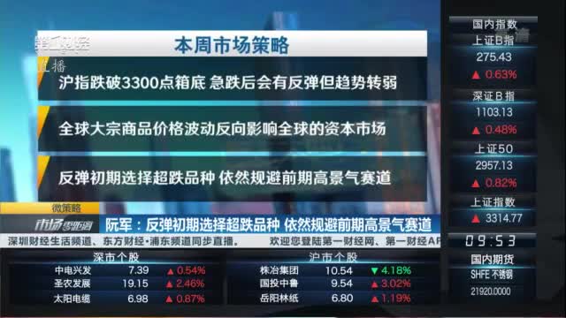 阮军认为沪指跌破3300点箱底 急跌后会有反弹但趋势转弱。全球大宗商品价格波动反向影响全球的资本市场。反弹初期选择超跌品种 依然规避前期高景气赛道。