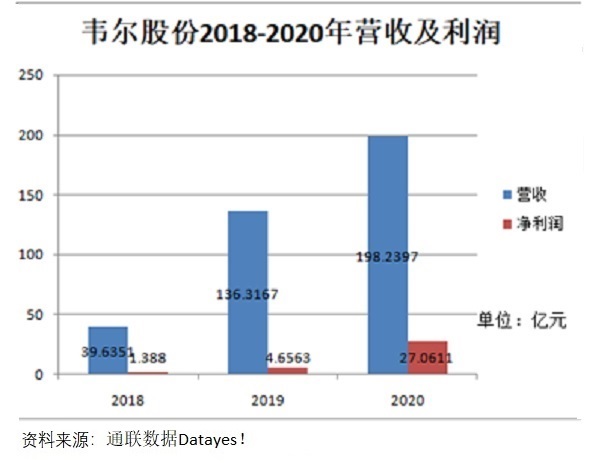业绩表现也许能够带来更加直观的感受。2018年,韦尔股份营业收入为39.64亿元,2019年并表后直接暴增近百亿,达到136.32亿元,2020年近200亿元。归母净利润方面,2019年也较2018年增长235%,2020年再度同比增长51.64%。