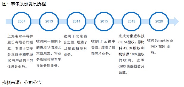2013年,韦尔收购了同一控制人旗下的香港华清和北京京鸿志;2014年,韦尔收购了北京泰和志,将业务拓展至SoC芯片领域;2015年,又收购无锡中普微,进一步拓展至射频芯片领域。