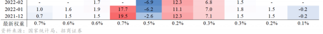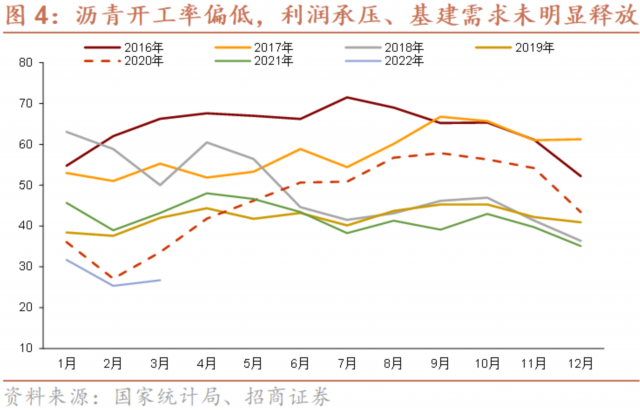 基建需求仍未释放。非金矿物制品环比为负、同比增幅收窄至8.2%(前值8.9%)。财政前置,21Q4的地方政府杠杆率已反弹至26.6%。不过据高频数据,沥青开工率和库存数据指向成本压力和消耗仍未明显提升。如能源和有色商品价格持续高位,可能会推升基建和房地产项目的成本,进而影响开工进度。