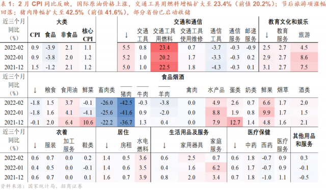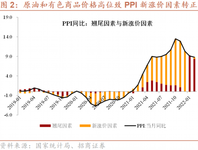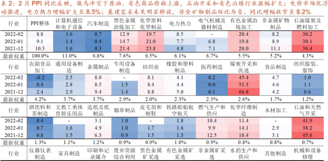 2月PPI同比正如预期,俄乌冲下国际原油价格或持续高位,致PPI同比降幅进一步放缓、年底小幅反弹。2月PPI同比的翘尾和新涨价因素影响分别为8.4和0.4个百分点(前值分别为9.2和-0.1个百分点)。原油、有色商品价格上涨,石油和天然气开采涨41.9%(前值38.2%),有色金属冶炼加工业涨20.4%(前值19.8%)。电价市场化浮动推进,电力热力增幅扩大至8.5%(前值7.7%)。