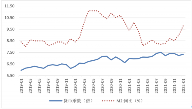 图2:中国货币乘数与M2同比增速(单位:倍;%)
