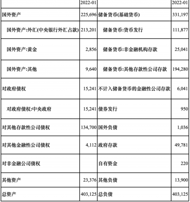 表1:截止2022年1月底中国人民银行资产负债表(单位:亿元人民币)