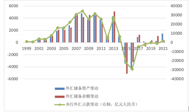 图1:中国年度外汇储备余额、外汇储备资产及央行外汇占款变动