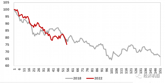 实际上,年初以来这波下跌中,创业板指数下跌速度已经超过了2018年调整期间,且跌幅(25%)已经接近完成2018年跌幅(35%)的70%。沪深300目前跌幅较小,距离2018年调整级别仍有较大距离。