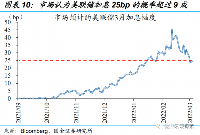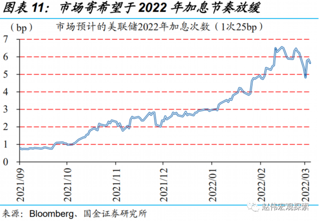 美联储也持续观望俄乌危机发展,使得市场对其加息预期大幅降温。俄乌战争爆发前,市场曾一度押注美联储3月加息50bp,全年加息次数(1次25bp)接近7次。目前来看,以主席鲍威尔在内的多位美联储核心官员也强调俄乌危机所带来的不确定性,对局势演绎持观望态度。受此影响,市场对美联储3月加息50bp的预期大幅弱化,并且下修全年加息次数至5次上下。