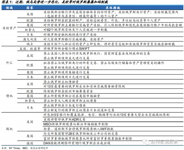 俄乌危机下,美欧等对俄罗斯屡屡加码制裁,使得主要市场加快调整。自2月21日俄罗斯宣布承认乌东地区独立、出兵乌克兰以来,以美欧为首的多个经济体陆续宣布冻结俄罗斯的部分海外资产,还分别从外汇、债权、股权等领域加码对俄制裁,使得俄乌局势持续恶化。受此影响,全球主要股指大幅调整,其中德国DAX、法国CAC40等欧洲股指的回撤幅度纷纷超过10个百分点。