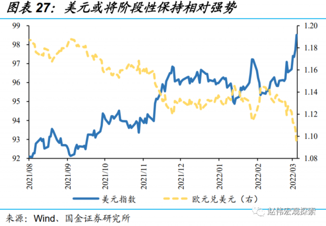 全球“滞胀”风险加速累积、资本市场波动加大的背景下,黄金配置价值凸显;美欧经济、政策环境的差异,或推动美元阶段性保持强势。历史经验显示,全球“滞胀”风险加速累积阶段,黄金价格往往易涨难跌。与此同时,全球资本市场波动率趋于上行,黄金作为最佳的对冲资产之一,配置价值已有所显露。另一方面,考虑到美欧经济基本面、货币政策节奏的差异,地缘冲突下,美元或阶段性保持相对强势。