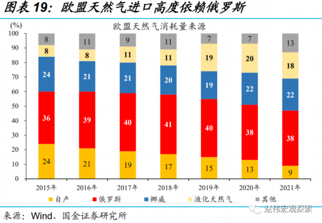 (2)俄乌危机导致的油价暴涨,对美国通胀形势的影响较为直接,对经济的冲击相对间接,对美联储政策正常化进度的影响,长短期效应或略有不同。欧盟方面,由于能源供应高度依赖俄罗斯,俄乌危机在推升欧盟通胀的同时,还直接冲击经济。