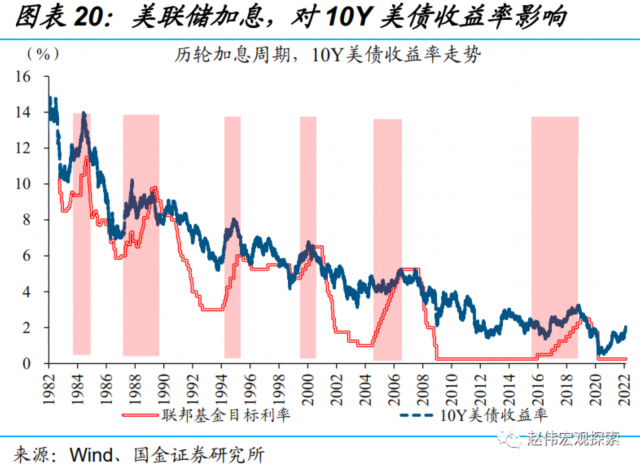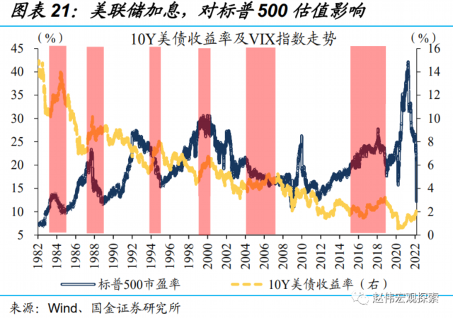 对全球通胀形势及政策正常化的定价不足,仍将是影响全球资产定价的重要因素。回溯历轮货币政策正常化周期来看,伴随政策利率抬升,10Y美债收益率往往趋于上行。作为全球资产定价的锚,10Y美债收益率的走势影响重大。历史经验显示,随着10Y美债收益率回归上行通道,美股等主要风险资产估值或将明显承压,价格波动也趋于加大。
