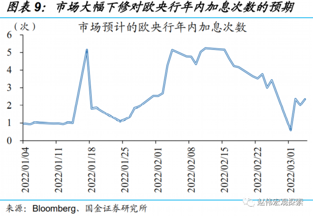 受此影响,欧央行加息态度边际软化,市场大幅下修对欧央行年内加息次数的预期。俄乌危机持续发酵,引发多位欧央行官员的关注,整体政策态度略微向“鸽派”倾斜。欧央行首席经济学家连恩称,“欧央行必须保持债券购买以缓冲乌克兰局势的影响”;欧央行管委雷恩也表示,“欧央行在评估战争影响之前不应退出刺激计划”。这一背景下,市场对欧央行2022年加息次数的预测,从俄乌战争前的5次左右大幅回落至2次上行。