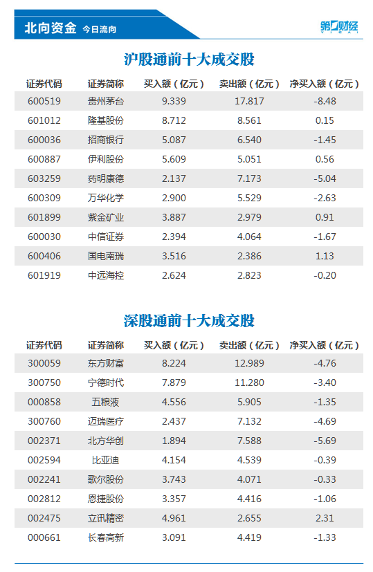 净卖出额居前三的是贵州茅台、北方华创、药明康德,分别获净卖出8.48亿元、5.69亿元、5.04亿元。