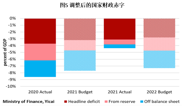 2021年预算的明细表明了财政紧缩的第二个源头。除了政府收支外,它还报告了三类表外资金账目:社会保障、国有企业的资本预算和其他政府管理的资金。我在图5中汇总了这些表外项目。它们的赤字以地方政府管理的资金为主,这些资金用于房地产相关活动。