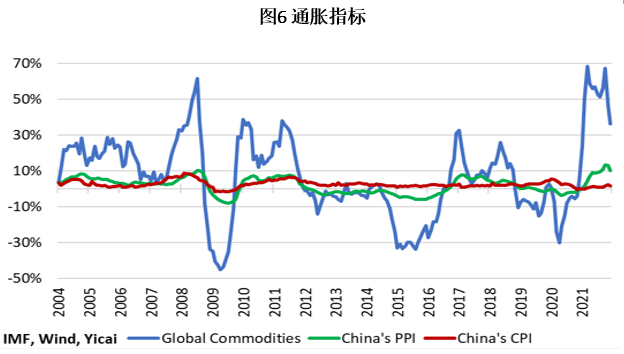 其次,中国是大宗商品的主要进口国,这场冲突导致石油和其他关键资源的价格大幅上涨。然而,大宗商品只占中国制造商品附加值的一小部分。因此,全球大宗商品价格上涨10%通常会导致中国生产者和消费者价格分别上涨1.7%和0.3%(图6)。