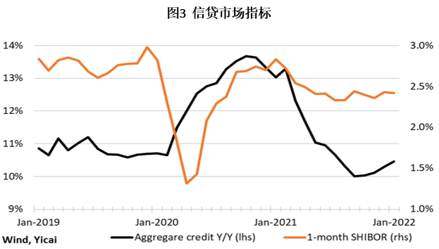 相比2021年,今年信贷政策在支持GDP增长方面力度更大。李克强总理在政府工作报告中指出,宏观杠杆率将趋于稳定,信贷总量将与名义GDP同步增长,这表明没有进一步去杠杆的必要。信贷增长在2021年大幅收紧后有所回升,一个月期贷款利率比疫情前的水平下降了约0.5个百分点(图3)。