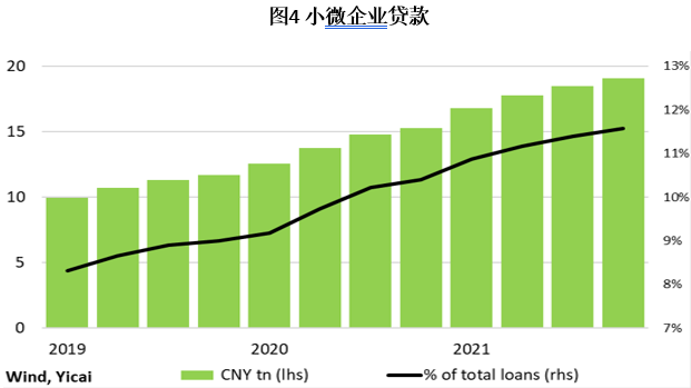 在最近一次讲话中,中国银保监会主席郭树清表示,信贷政策将通过针对小微企业来支持经济。这些企业的贷款已经迅速增长,从2019年第一季度的10万亿元增长到2021年底的19万亿元,现在这些贷款占全部未偿贷款的比例为11.6%(图4)。尽管如此,只有30%的小微企业能够获得贷款。郭树清表示,银行将利用数字技术来改善金融服务。